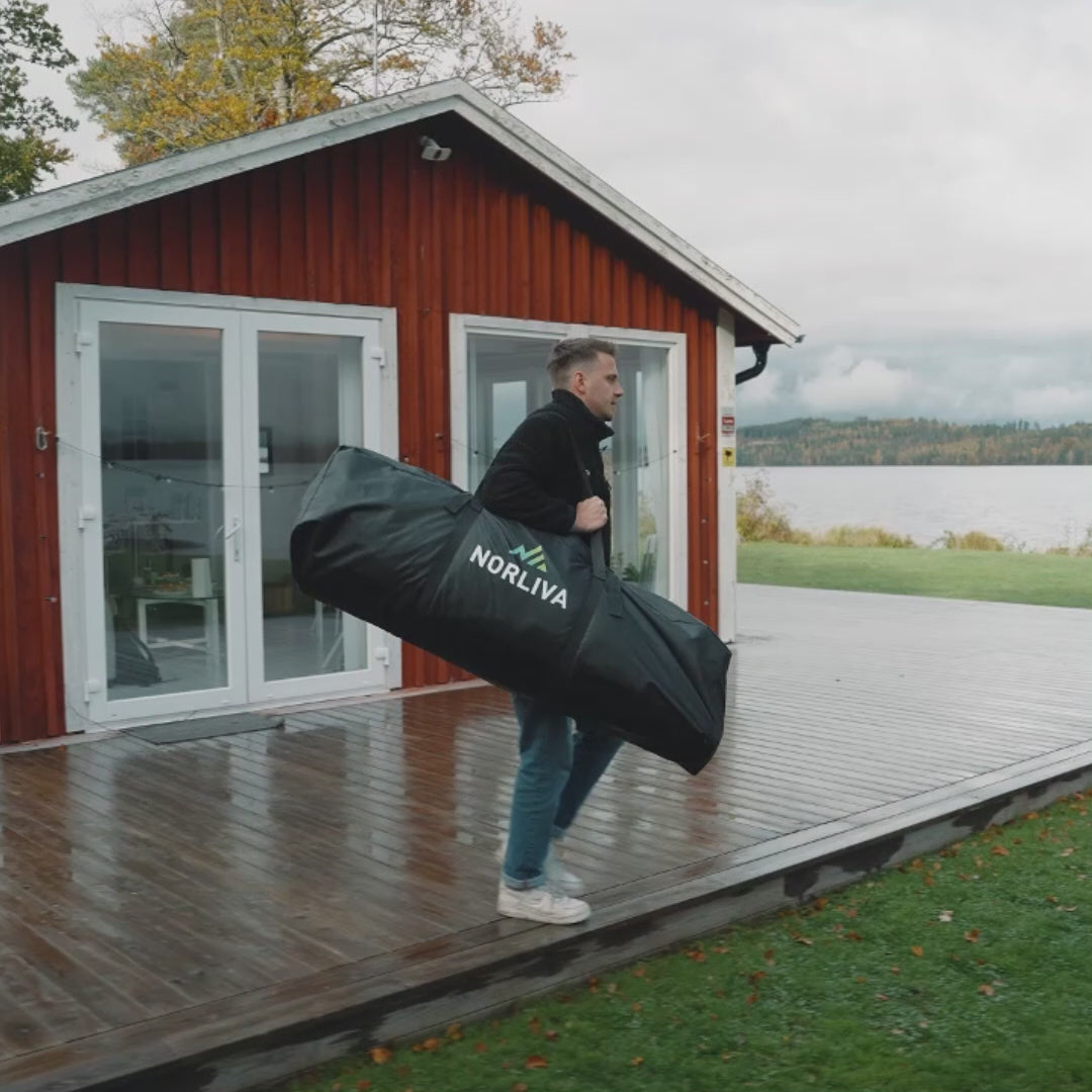 Namiot saunowy NORLIVA rozkłada się jak namiot typu pop-up w zaledwie 1 do 2 minut. Wystarczy go rozłożyć, ustawić stelaż, umieścić i podłączyć piec – i gotowe. Cały montaż zajmuje około 5 minut i nie wymaga narzędzi.
